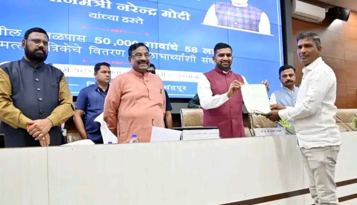 नियोजन भवन सभागृह येथे स्वामित्व योजनेअंतर्गत लाभार्थ्यांना सनद वाटप कार्यक्रमाप्रसंगी ते बोलत होते. कार्यक्रमाला कार्यक्रमाला आमदार सर्वश्री सुधीर मुनगंटीवार, देवराव भोंगळे, सुधाकर अडबाले, प्रभारी जिल्हाधिकारी विवेक जॉन्सन, उपमुख्य कार्यकारी अधिकारी (पंचायत) मीना साळुंखे, जिल्हा अधीक्षक (भुमि अभिलेख) भूषण मोहिते, डॉ. मंगेश गुलवाडे, ग्रामसेवक, सरपंच तसेच ग्रामस्थांची उपस्थिती होती.