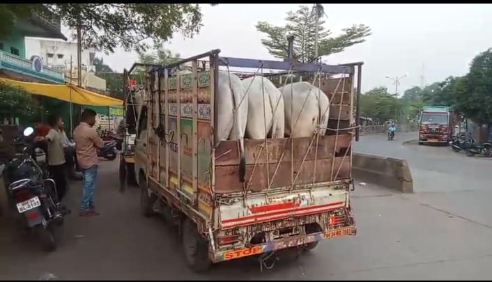 चंद्रपुर  जिले की बल्लारपुर पुलिस ने कत्तल के लिए ले जा रहे 4 गोवंश को मुक्त कराया और एक पिकअप वाहन समेत 3 लाख 50 हजार रुपये का माल जब्त किया है. वाहन चालक प्रतीक महेंद्र धंदरे (25) बामनी निवासी को गिरफ्तार किया है और संदीप यादव भगत सिंह वार्ड बल्लारपुर निवासी फरार हुआ है। सहायक फौजदार रमेश मेश्राम कल 28 मार्च की रात नौ बजे बल्लारपुर पुलिस स्टेशन में ड्यूटी पर थे, तब उन्हें गुप्त जानकारी मिली कि गोल पुलिया रोड से एक पिकअप वाहन में दो गाय व दो बछड़ों को कत्ल खाने ले जाया जा रहा है । इस आधार पर पुलिस अधिकारियों व कर्मचारियों के साथ गोल पूल के पास जाल बिछाकर पिकअप वाहन क्रमांक एमएच 34 बीजेड 1661 को रोककर जांच की गई तो उसमें 30 हजार रुपए कीमत की गोवंश नस्ल की 2 गायें और 20 हजार रुपए कीमत की 2 बछड़े मिले। पुलिस ने जब आरोपी प्रतीक महेंद्र धंदरे से आगे पूछताछ की तो संदीप यादव भगत सिंह वार्ड बल्लारपुर के पालतू दो गाय और दो बछड़ों को कत्तल के लिए चंद्रपुर ले जाया जा रहा है। इस आधार पर बल्लारपुर पुलिस ने आरोपियों के खिलाफ मामला दर्ज किया है. यह कार्रवाई बल्लारपुर के थानेदार श्याम गव्हाणे के मार्गदर्शन में की गयी. पुलिस उपनिरीक्षक सौरभ सालुंखे, सहायक फौजदार रमेश मेश्राम, पुलिस कांस्टेबल संदेश, सैनिक दर्शन आदि ने किया. बल्लारपुर शहर में बड़ी मात्रा में गोमांस बेचा जा रहा है और पुलिस विभाग इसे नजर अंदाज कर रहा है